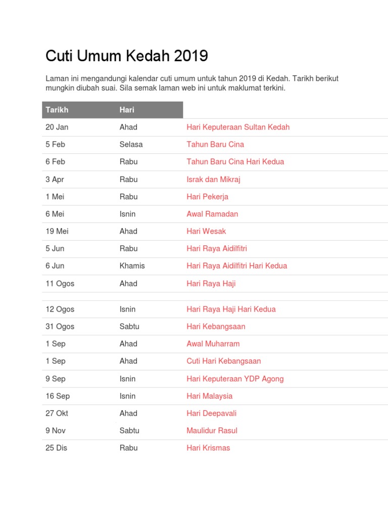 Tarikh berikut mungkin diubah suai. Berikut adalah cuti umum 2019 di kerjakosong.co. Senarai cuti umum ini adalah berdasarkan rujukan pelbagai. Semoga kalender/takwim cuti umum 2019 (hari kelepasan am) dan cuti sekolah 2019 ini dapat membantu anda dalam membuat perancangan awal percutian keluarga seperti memilih destinasi, membeli tiket penerbangan, menempah hotel dan sebagainya. Cuti umum kedah 2020 cuti kelepasan am dan cuti persekolahan bagi kedah untuk tahun 2020.