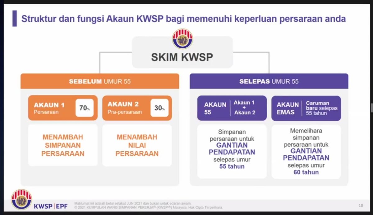 Apabila mencapai umur 55 tahun, caruman yang diterima ke dalam akaun 1 dan akaun 2 anda akan digabungkan ke dalam akaun 55. Belum mencapai umur 60 tahun. Ia merupakan peluasan kepada pengeluaran usia 55 tahun dengan umur persaraan minimum 60 tahun. Pengeluaran untuk kategori ini adalah sambungan kepada kebenaran pengeluaran umur 55 tahun sedia ada selaras dengan umur persaraan minimum 60 berdasarkan konsep ini, caruman bulanan kepada kwsp dianggap sebagai pendapatan. Dengan ini, ahli boleh mendapat jumlah pinjaman yang.